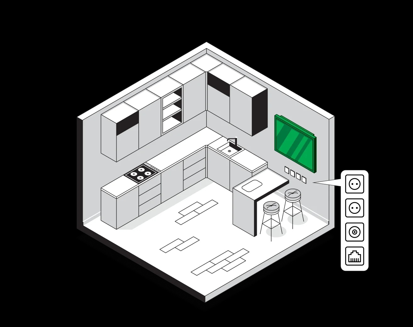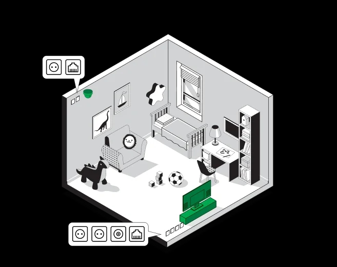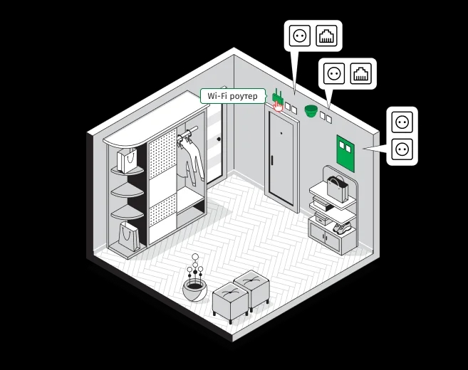 2 розетки 220В + 1 розетка Ethernet + 1 розетка под коаксиальный кабель в месте установки телевизора.